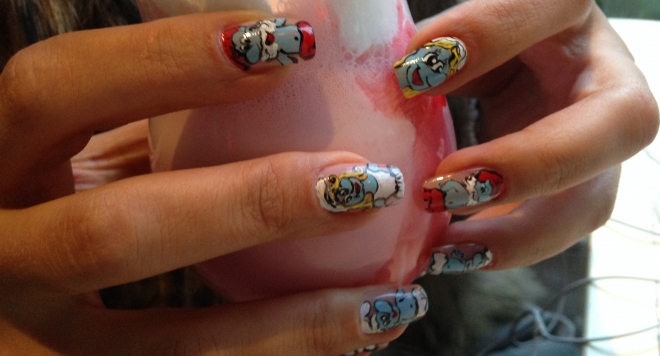 На фотоса виждаме как Сърдитко, Смърфиета, Многознайко, татко Смърф и Мързеливко греят, майсторски изрисувани, върху ноктите на певицата.