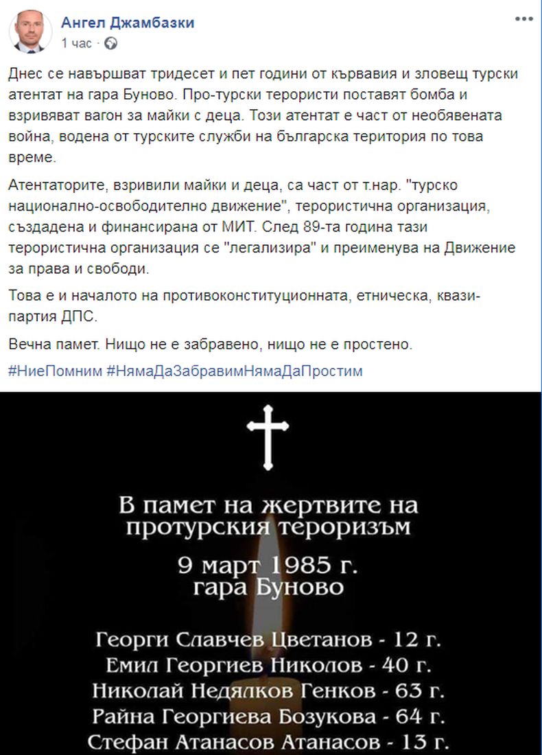 Днес се навършват тридесет и пет години от кървавия и зловещ турски атентат на гара Буново. Про-турски терористи поставят бомба и взривяват вагон за майки с деца. Този атентат е част от необявената война, водена от турските служби на българска територия по това време. Това написа във Фейсбук евродепутатът и зам.-председател на ВМРО Ангел Джамбазки.