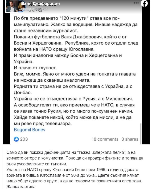 Това написа във Фейсбук страницата си Ваня Джаферович, който сподели пост на Нона Йотова.