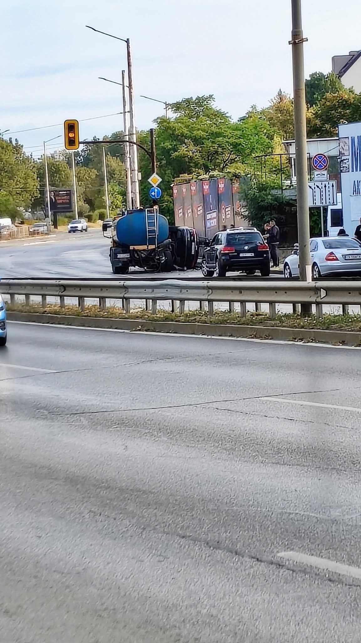Катастрофа между автомобил и камион цистерна, миеща улиците в София, стана в неделя рано сутринта на кръстовището между бул. „Константин Величков“ и ул. „Възкресение“.