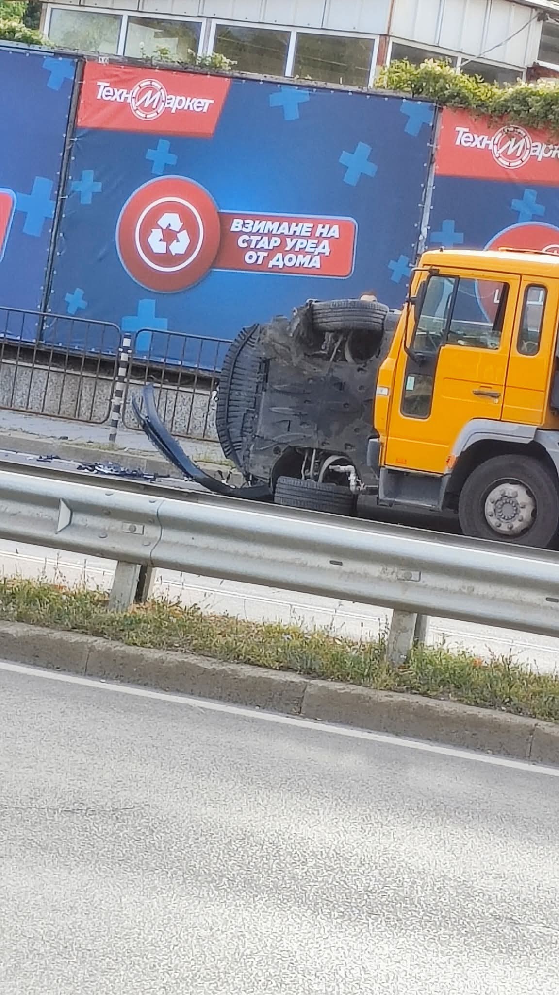Към момента няма данни за пострадали хора. На място има аварийни екипи, разчистващи катастрофата. По данни на Столичната община, камионът е бил спрял на червен светофар. Отзад го блъска лека кола с 19-годишен водач.