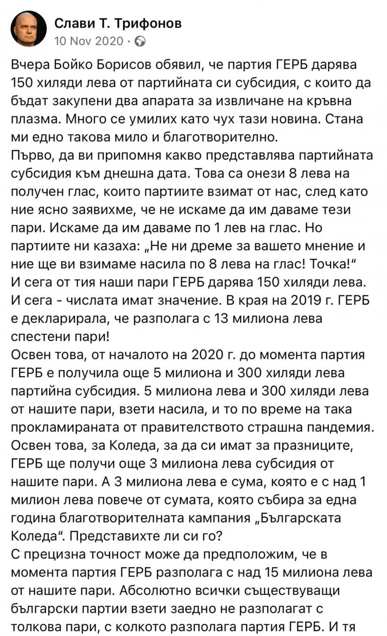Акт на добротворчество или пренасочване на държавни средства е даряването на партийната субсидия? 180 градусов завой изглежда е направило мнението на Слави Трифонов за по-малко от 1 календарна година.