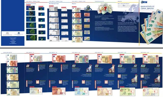 Българската народна банка показа дизайна и защитните елементи на евробанкнотите. Банкнотите имат релефен печат, портретен воден знак, прозорче с портрет, портретна холограма, смарагдовозелено число и сателитна холограма.