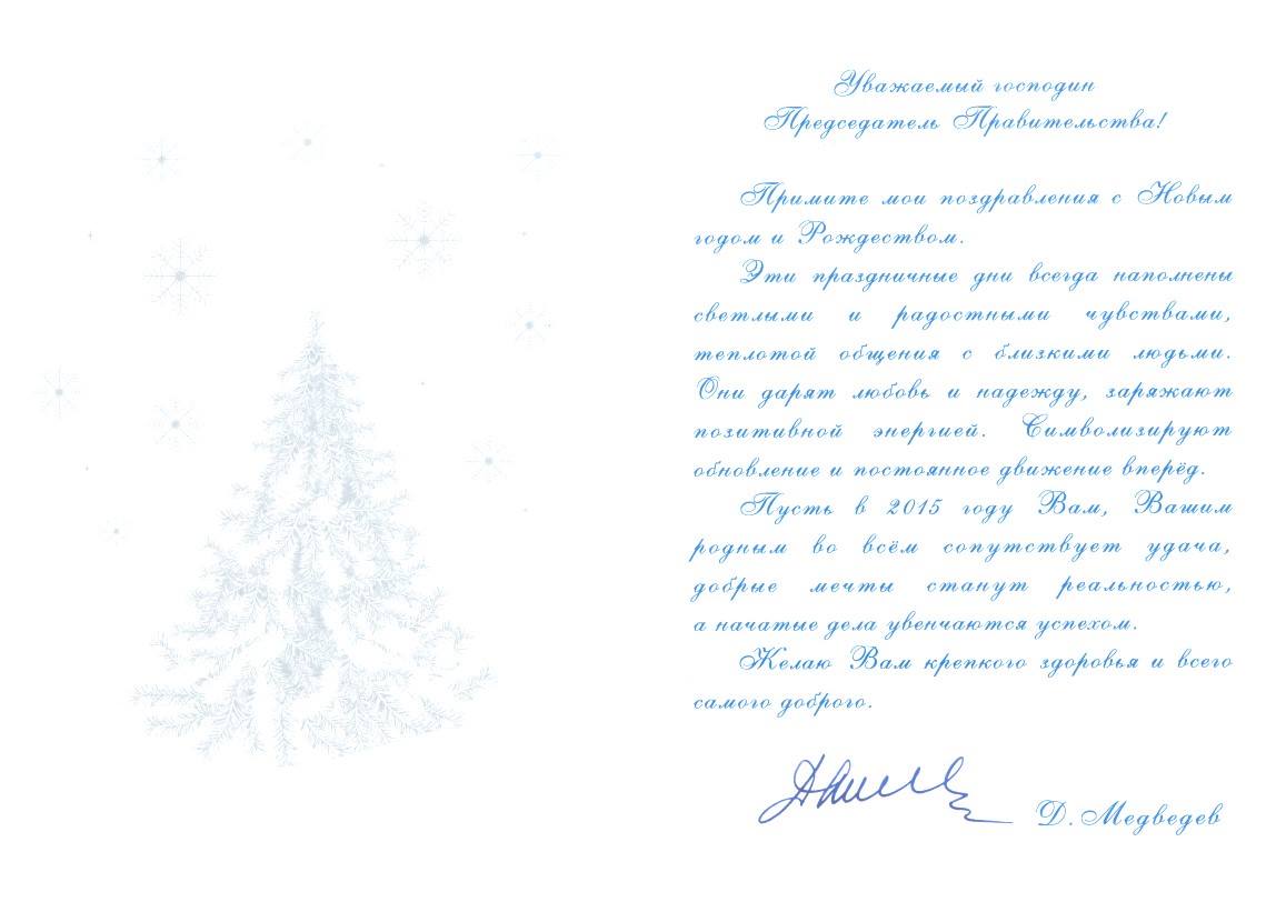 Министър-председателят на Руската федерация Дмитрий Медведев е изпратил поздравителна картичка до българския министър-председател Бойко Борисов.