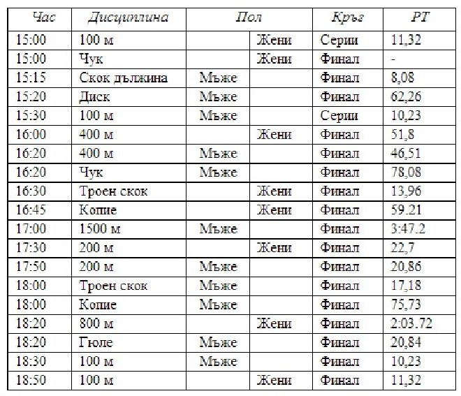 Атлет №1 на България Георги Иванов ще бъде в сектора за тласкане на гюле. Петър Кременски, Боян Петров, Георги Георгиев, Кирил Кирилов ще са на старта на 100 м.