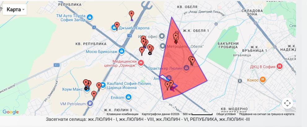 Прекъснато е електрозахранването в няколко столични квартала. Ток няма в жк. Обеля - 1 и Обеля - 2, както и в части от жк. "Люлин" - ж.к. Люлин I, ж.к. Люлин III, ж.к. Люлин VI, ж.к. Люлин VIII, кв. Република, Връбница 1 и 2, кв. Модерно предградие, Волуяк, Толева махала.