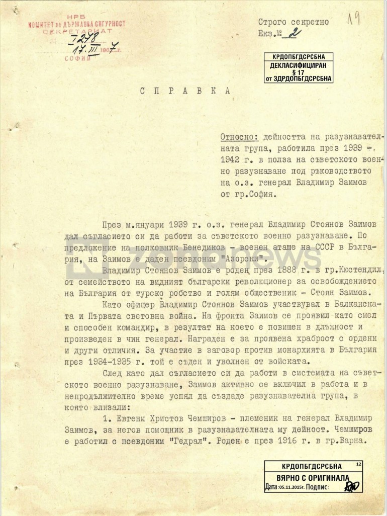 Документи от архива на Комисията по досиетата обаче разобличават напълно думите му. От подробна официална кореспонденция между КДС (както се е наричала през 60-те г. Държавна сигурност) и съветския КГБ се разбира, че ген. Владимир Заимов и неговата шпионска група е доставяла не само информация за „дислокацията на германските войски в България“, но „е успяла да предаде на съветските разузнавателни органи много ценни сведения от стопански, политически и военен характер“, пише zonanews.bg.