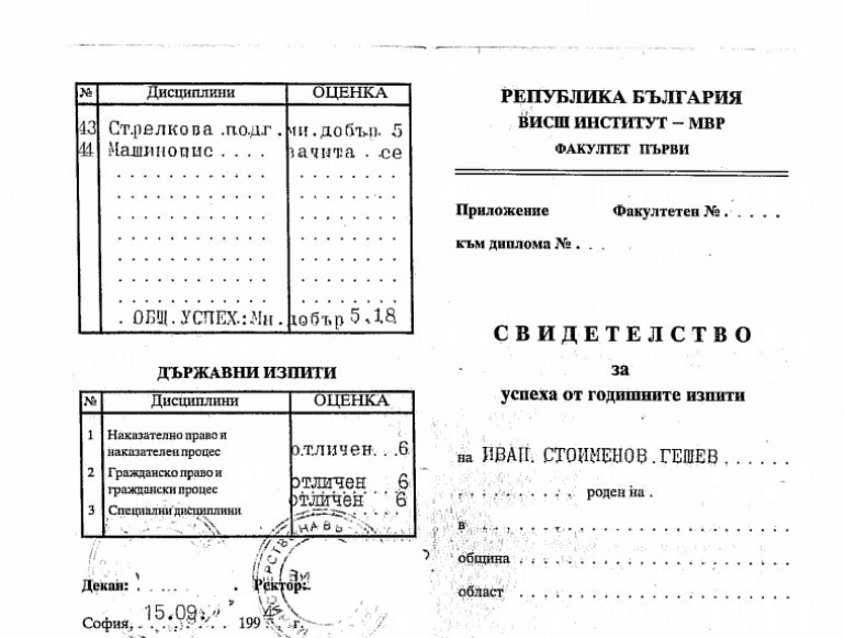 Номинираният за главен прокурор Иван Гешев взима държавните изпити по право с отличен. Това става ясно от дипломата на заместник-главния прокурор, която е публикувана на страницата на Висшия съдебен съвет (ВСС). Както е известно, Гешев получава висшето си юридическо образование преди 25 години във Висшия институт на МВР, трансформиран по-късно във Висш институт за подготовка на офицери и научно-изследователска дейност (ВИПОНД), а понастоящем Академия на МВР, пише „Правен свят“.