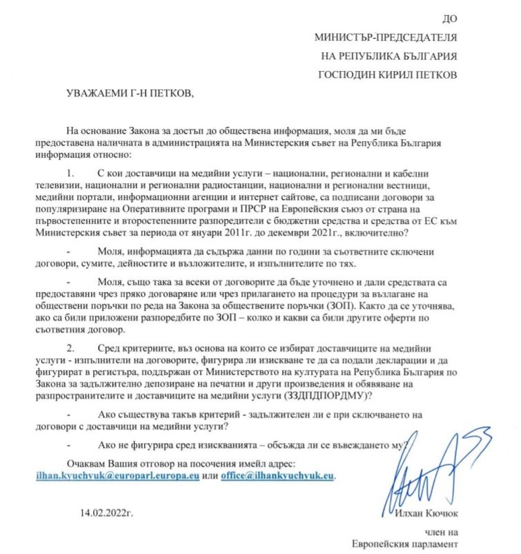 Питането обхваща периода от януари 2011 до декември 2021 г. включително. Кючюк настоява да бъде предоставена наличната в администрацията на МС информация относно всички договори, сключени с доставчици на медийни услуги у нас от първостепенните и второстепенните разпоредители с бюджетни средства и средства от ЕС към Министерския съвет. Иска също така данни и дали договорите са били сключени с пряко договаряне или по реда на Закона за обществените поръчки (ЗОП). Както и дали сред критериите за сключването им е било изискване съответните медии да са подали декларации и да фигурират в регистъра, поддържан от Министерството на културата на Република България по Закона за задължително депозиране на печатни и други произведения и обявяване на разпространителите и доставчиците на медийни услуги (ЗЗДПДПОРДМУ).