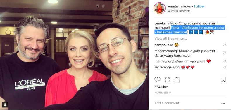 От известне време Венета споделя в "Инстаграм" снимки с новия екип, който се грижи за визията й - на Любомир Николов разчита за грима и на Валентин Цветков за косата.