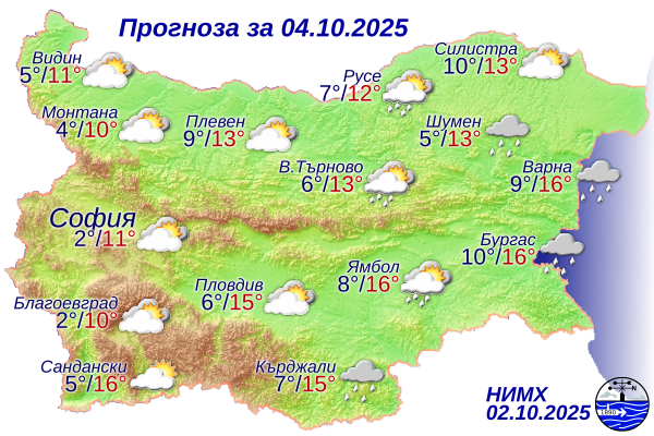 По Черноморието ще бъде облачно и ще вали дъжд. Ще продължи да духа силен североизточен вятър. Максималните температури ще бъдат между 17° и 19°. Температурата на морската вода е 20°-22°. Вълнението на морето ще бъде около 4 бала, съобщават от НИМХ.
