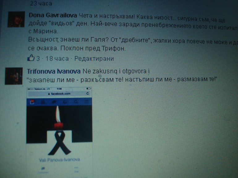 Аз и Марина към този момент НЕ сме поканени, нито уведомени, нито попитани за каквото и да било, свързано с нея”, възмущава се Галина Иванова. Тя разказва също, че когато със сестра си пристигнали за панихидата, били посрещнати пред вратата на дома на Трифон и им била дадена визитка на търновска адвокатка която сега вече го „представлявала”.