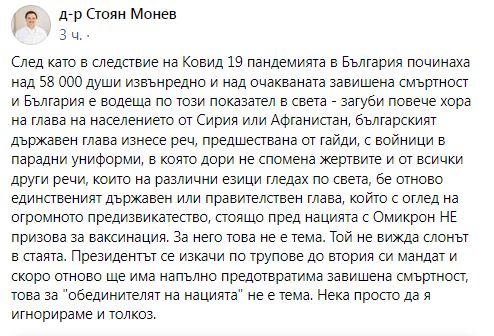 "Българският държавен глава изнесе реч, предшествана от гайди, с войници в парадни униформи, в която дори не спомена жертвите и от всички други речи, които на различни езици гледах по света, бе отново единственият държавен или правителствен глава, който с оглед на огромното предизвикатество, стоящо пред нацията с Омикрон НЕ призова за ваксинация." това написа във "Фейсбук" д-р Стоян монев, български лекар в Германия. Поводът е новогодишното обръщение на президента Радев.