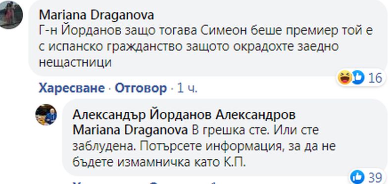 Постът на Александър Йорданов набра бързо одобрение. Читателка задава въпрос защо "Симеон беше премиер с испанско гражданство". Александър Йорданов обаче отвръща: " В грешка сте. Или сте заблудена. Потърсете информация, за да не бъдете измамничка като К.П."