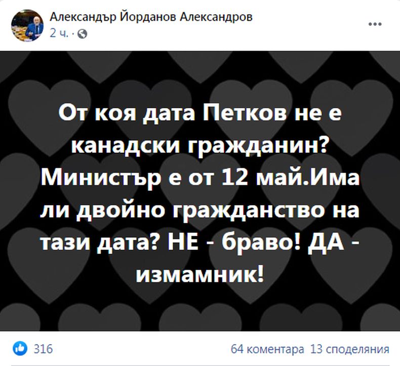 "От коя дата Петков не е канадски гражданин? Министър е от 12 май. Има ли двойно гражданство на тази дата? НЕ - браво! ДА - измамник!" Това написа в профила си във "Фейсбук" евродепутатът Александър Йорданов.