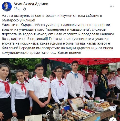 "Аз съм възмутен, аз съм втрещен и изумен от това събитие в българско училище! А освен за евтината баничка и боза, обясниха ли на децата за мракобесната Държавна сигурност, за жестоките концлагери, символ на човешкото безумие? Споменаха ли им за концлагерите Белене, Скравена, Куциян, Богданов дол? А обясниха ли на тези съвременни пионерчета и чавдарчета, с червените пионерски връзки на врата, че тогава за един безобиден виц за тези видни държавници, чиито портрети са били на сергията им, вкарваха хората в тези концлагери и мнозина не излизаха живи оттам? Обясниха ли им кои хора тогава се наричаха "бивши хора"?" Това гневно написа в профила си във "Фейсбук" евродепутатът Асим Адемов. Поводът за негодуванието му е възстановката, с която учениците от четирите девети класа на СУ "Петко Рачов Славейков" върнаха времето с 40 години и се пренесоха в бита и начина на живот на хората в епохата на социализма.
