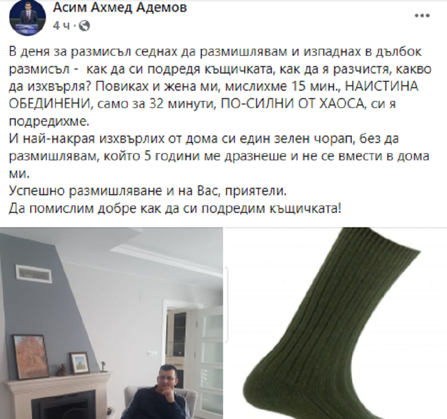 “В деня за размисъл седнах да размишлявам и изпаднах в дълбок размисъл - как да си подредя къщичката, как да я разчистя, какво да изхвърля?“, написа той в социалната мрежа. Адемов е публикувал и снимка на въпросния зелен чорап.