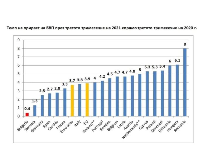 Данните на Евростат са директен удар от Европа за управлението на Румен Радев и служебните му кабинети, които самом за няколко месеца потопиха България на дъното на ЕС, тъй като по време на управлението на Бойко Борисов, Българя отбеляза сериозен възходящ тренд за първото тримесечие на годината.