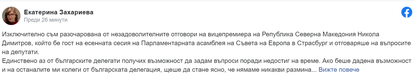 Изключително съм разочарована от незадоволителните отговори на вицепремиера на Република Северна Македония Никола Димитров, който бе гост на есенната сесия на Парламентарната асамблея на Съвета на Европа в Страсбург и отговаряше на въпросите на депутати. Това коментира бившият външен министър Екатерина Захариева по повод поредното напрежение между България и северозападната ни съседка.
