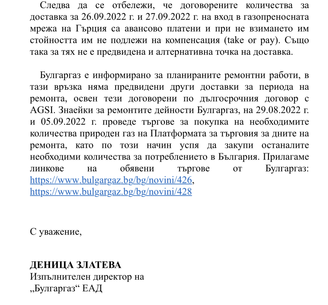 Следва да се отбележи, че договорените количества за доставка за 26.09.2022 г. и 27.09.2022 г. на вход в газопреносната мрежа на Гърция са авансово платени и при не взимането им стойността им не подлежи на компенсация (take or pay). Също така за тях не е предвидена и алтернативна точка на доставка.