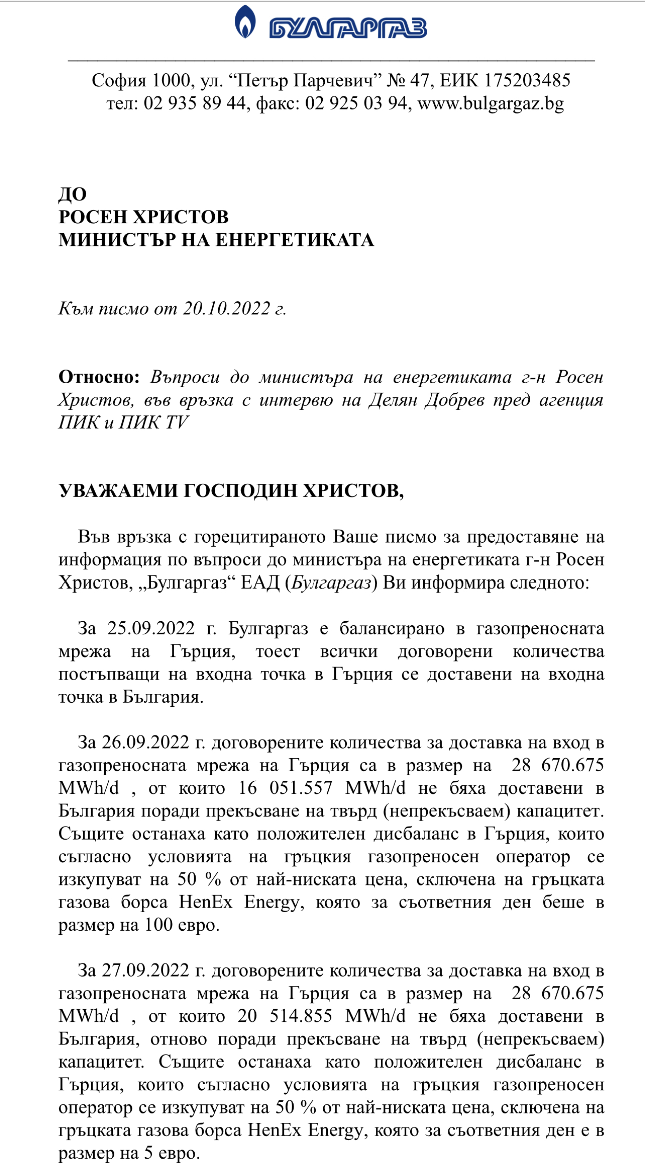 Ето и целия отговор от "Булгаргаз" до енергийният министър Росен Христов на въпросите на ПИК: