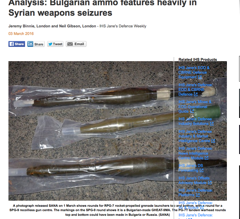 „Това показват снимки, които разпространява Сирийско-арабската новинарска агенция (САНА). Става въпрос за муниции от 39 и 54 милиметра, гранатомети и припаси за минохвъргачки”, пише в статия на изданието, озаглавена „Български боеприпаси със сериозна роля в конфликта в Сирия”.