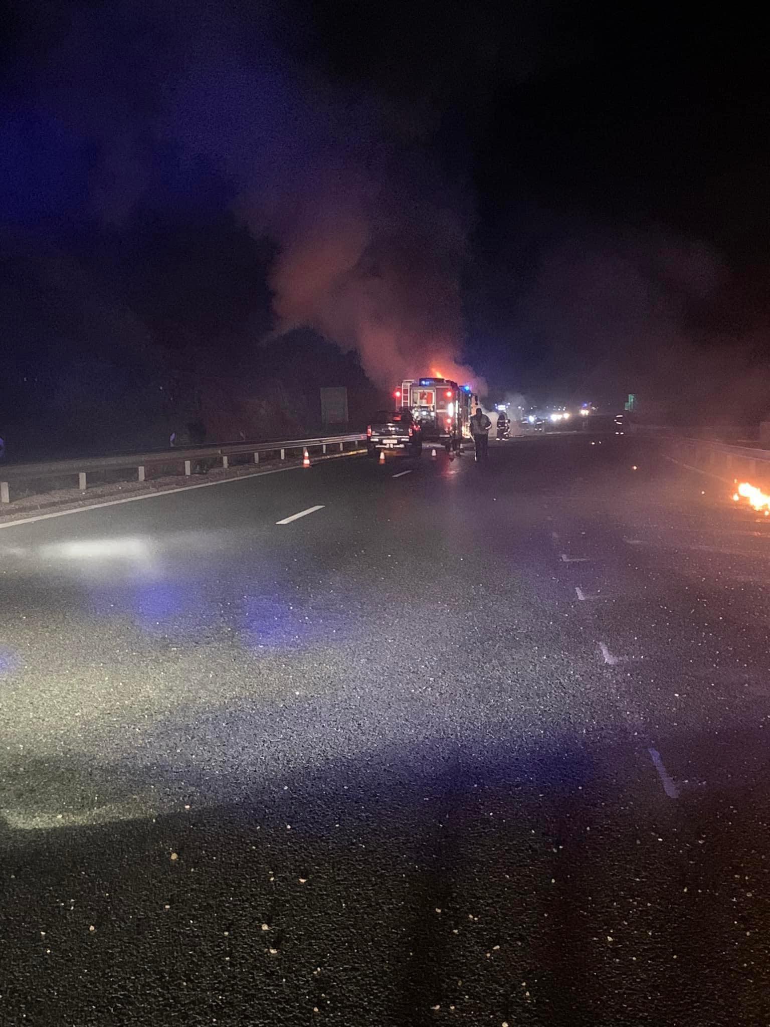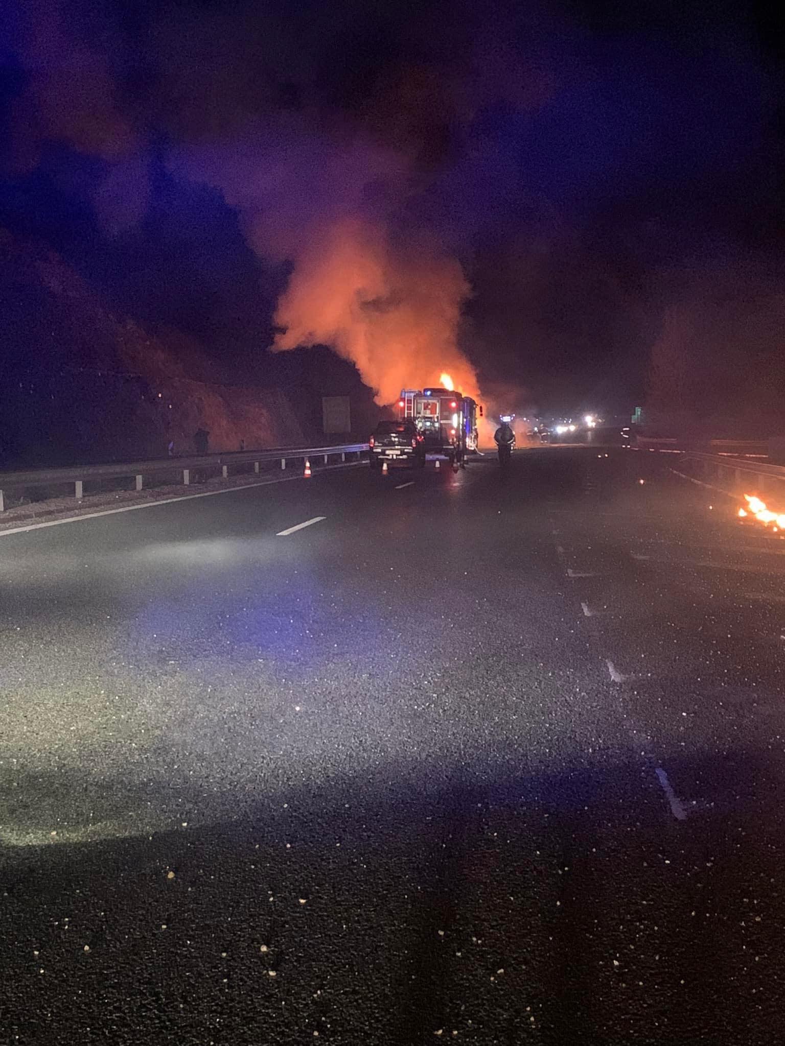 Зловещи кадри от първите минути след зловещия инцидент с македонския автобус на АМ "Струма". На снимките, разпространени в социалната мрежа, се вижда как автобусът е обвит в пламъци, очевидно катастрофата е станала малко преди това.