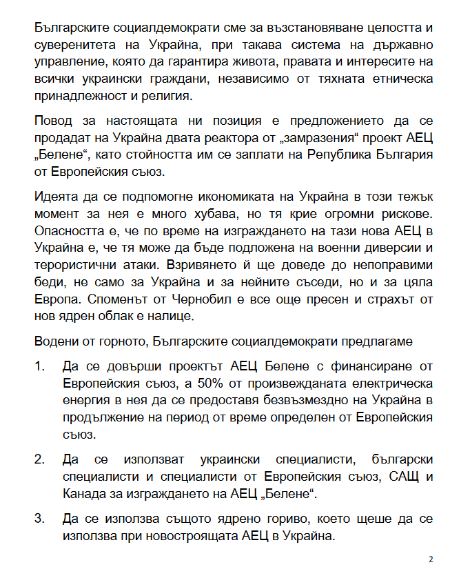 "Затова ние взехме решение и от другата седмица ще го изпратим на съответните органи като ЕС и Партията на европейските социладемократи, както и до правителството на Република България, до народните представители и т.н. Ние предлагаме, вместо да се пращат тези реактори в Украйна и да се строи там АЕЦ, а ние да получим едни пари, които не знаем дали ще стигнат за направата на нова АЕЦ, по-добре ЕС да финасира изграждането на АЕЦ "Белене", защото там има голяма готовност. След изграждането на АЕЦ в България с тези реактори половината от електричеството, произведено от нея, ние да даваме безвъзмездно на Украйна", представи Анастасов предложението на партия Български Социалдемократи.