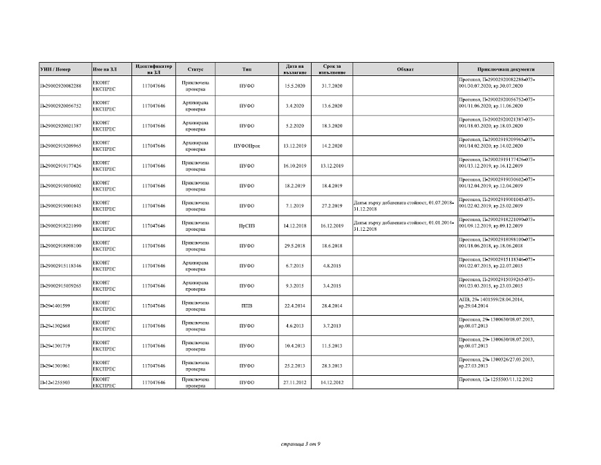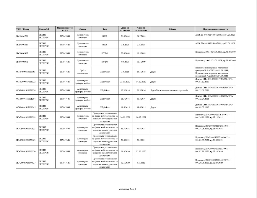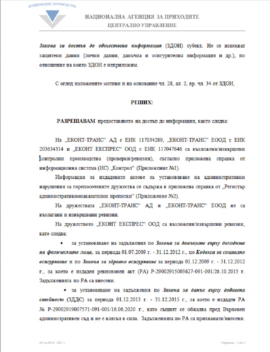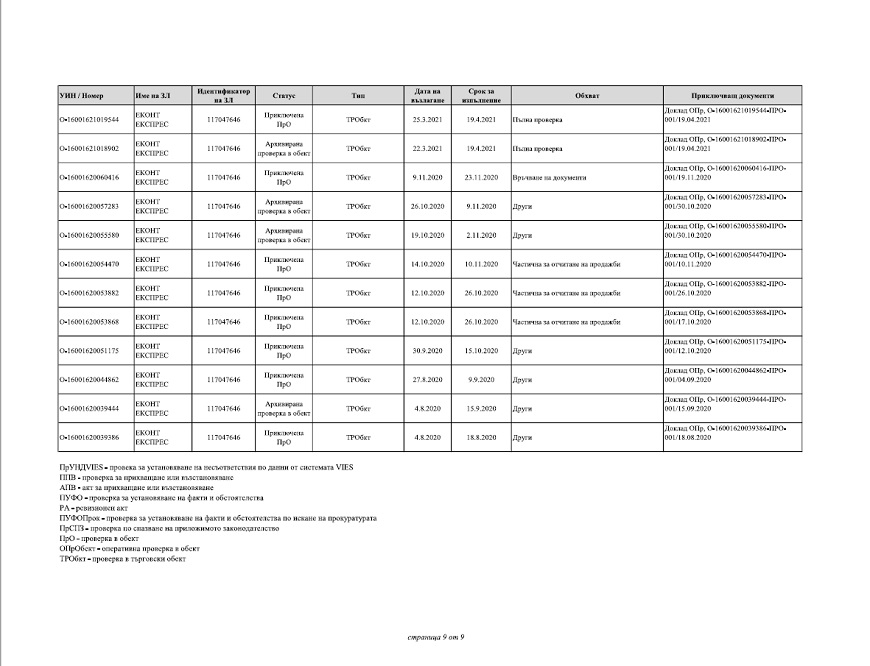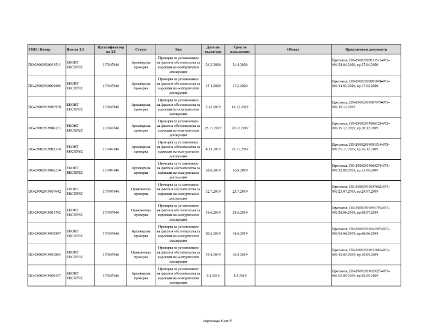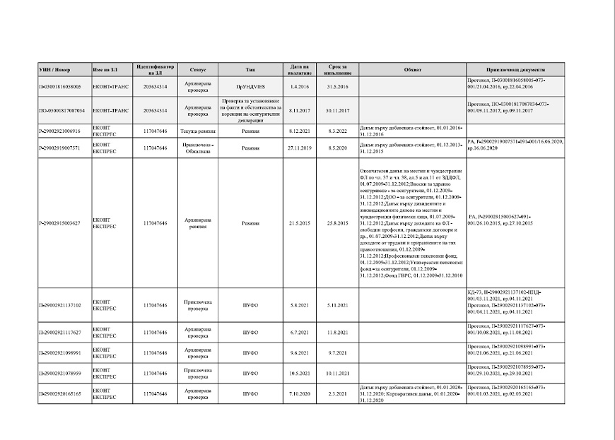 Според отговора на НАП до ПИК на дружеството „ЕКОНТ ЕКСПРЕС“ ООД са възложени и извършени следните ревизии: