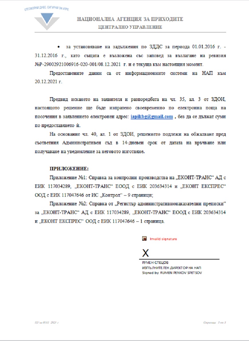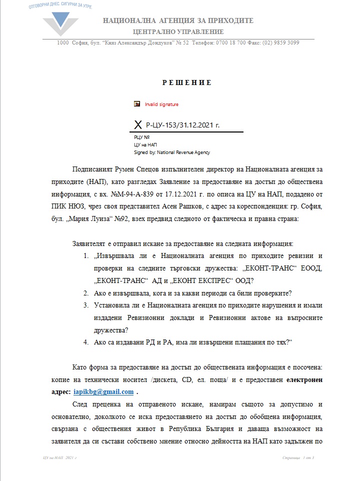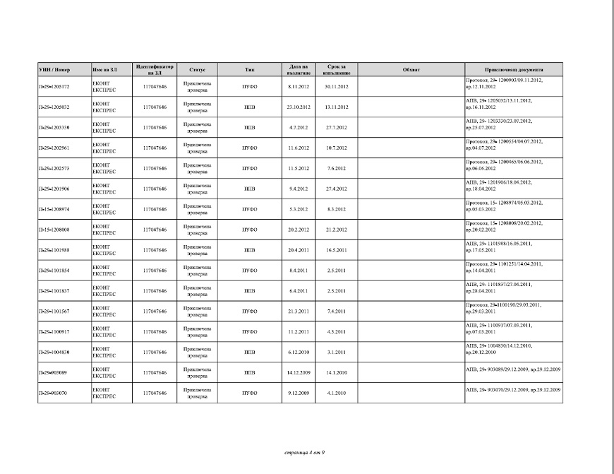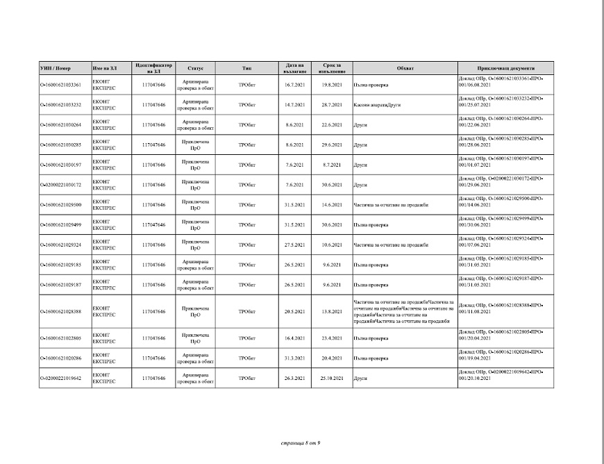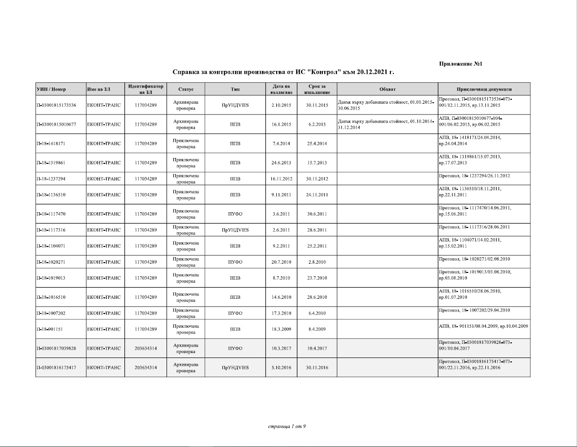Според отговора на НАП до ПИК на дружеството „ЕКОНТ ЕКСПРЕС“ ООД са възложени и извършени следните ревизии: