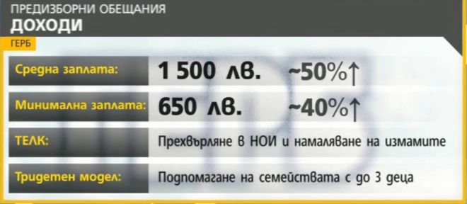 ГЕРБ обещават чувствителен ръст на доходите. От Партията на Бойко Борисов казват, че ще вдигнат средната заплата на 1500 лв., а минималната с 40 на стои тя да стане 650 лв.