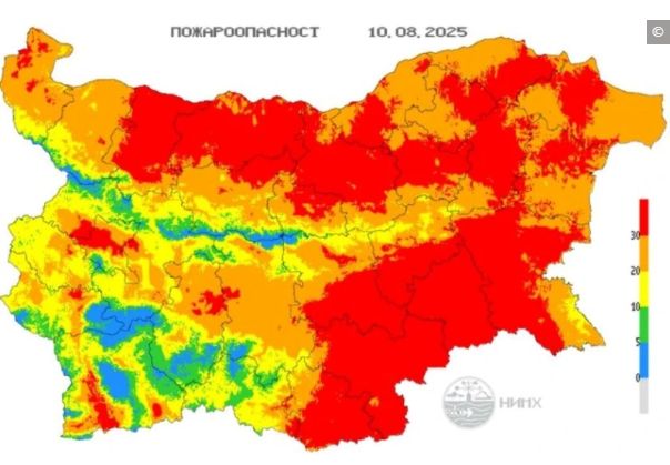 Пореден ден с горещини и висок риск от пожари! Общият индекс за пожароопасност от НИМХ за 10.08.2025 г. е за екстремален риск от пожари за югоизточна, както и значителна част от територията на северна България. Това съобщиха от Пожарна безопасност и защита на населението.