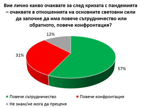 57% смятат, че след пандемията светът ще се промени сериозно, 37% са на обратното мнение, а останалите се затрудняват да отговорят. 57% вярват, че в утрешния свят основните сили ще проявяват повече сътрудничество. 31% обаче смятат, че в утрешния свят ще има повече конфронтация. Все пак, надеждата очевидно надделява.