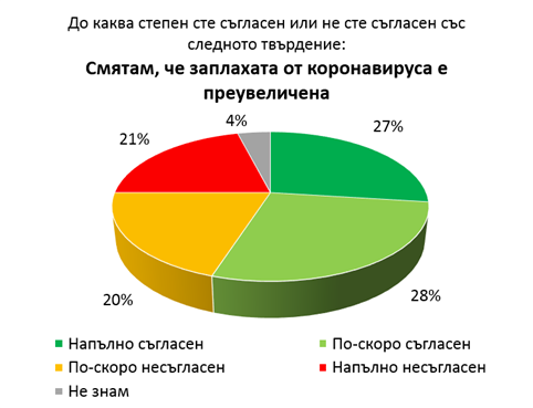Преди въвеждането на извънредното положение обаче онези, които намираха заплахата за преувеличена бяха много повече от сега – 72%, а на противоположното мнение бяха 27%. Оказва се, че преди разрастването на заразата у нас явно повече хора са я подценявали. Все пак и днес, в разгара на заразата, по-голям дял остават онези, които я намират за преувеличена.
