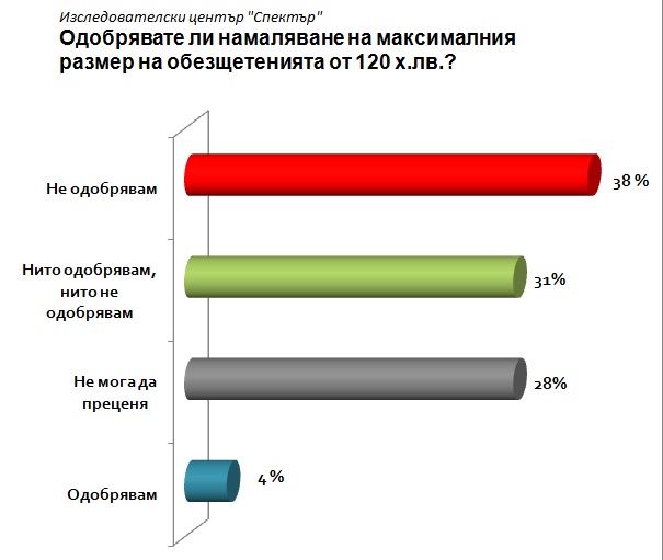 Повече от една трета (38%) от респондентите категорично не одобряват намаляването на максималния размер на застрахователното обезщетение от 120 хил. Според тях, по този начин ще намалее финансовата сигурност за хората при възникнал инцидент. Подобна мярка среща подкрепа от едва 4%. В същото време е висок делът на изразяващите по-скоро неутрално мнение по въпроса (31%) или не могат да преценят – 28% (вж. Фигура 3). Това се дължи на факта, че респондентите имат по умерено отношение по този въпрос. Резултатите сочат, че е необходимо и по-широко обществено обсъждане по този проблем.