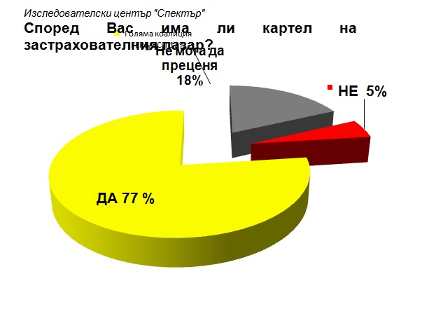 Повече от две трети е делът на анкетираните, които са на мнение, че застрахователният пазар а картелиран, което оказва влияние на цените на ГО (77%) – вж. Фигура 2. Това е много голям процент, който характеризира цялата картина на обществото по тази проблематика. Усещането на респондентите за договорка на застрахователния пазар е изключително негативно явление, върху което е необходимо да работят всички застрахователни институции.