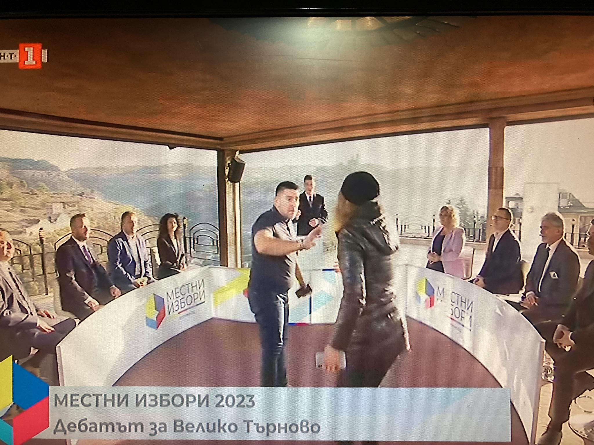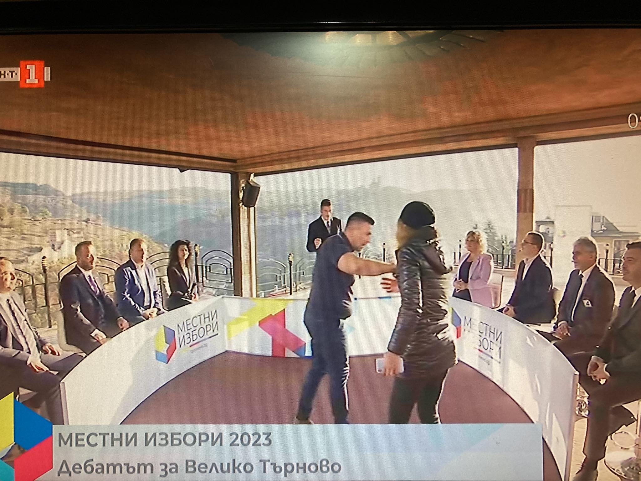 Мъж, който се представи за кандидат за общински съветник, нахълта в живото студио на БНТ по време на дебат с кандидати за кметове за Велико Търново в старата столица. Дебатът на живо бе прекъснат по време на опитите на водещия Симеон Иванов и част от екипа на националната телевизия да изгонят мъжа натрапника.