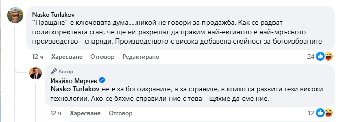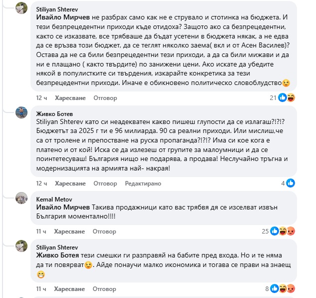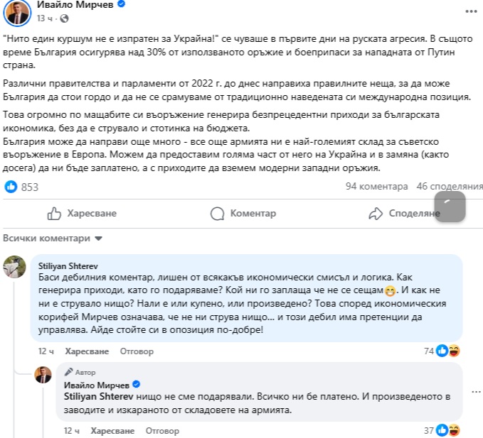 Позицията му обаче предизвика негативни реакции и един от потребителите отдолу под коментара написа, че Мирчев е дебил. Това пък доведе до словесна престрелка между двамата.