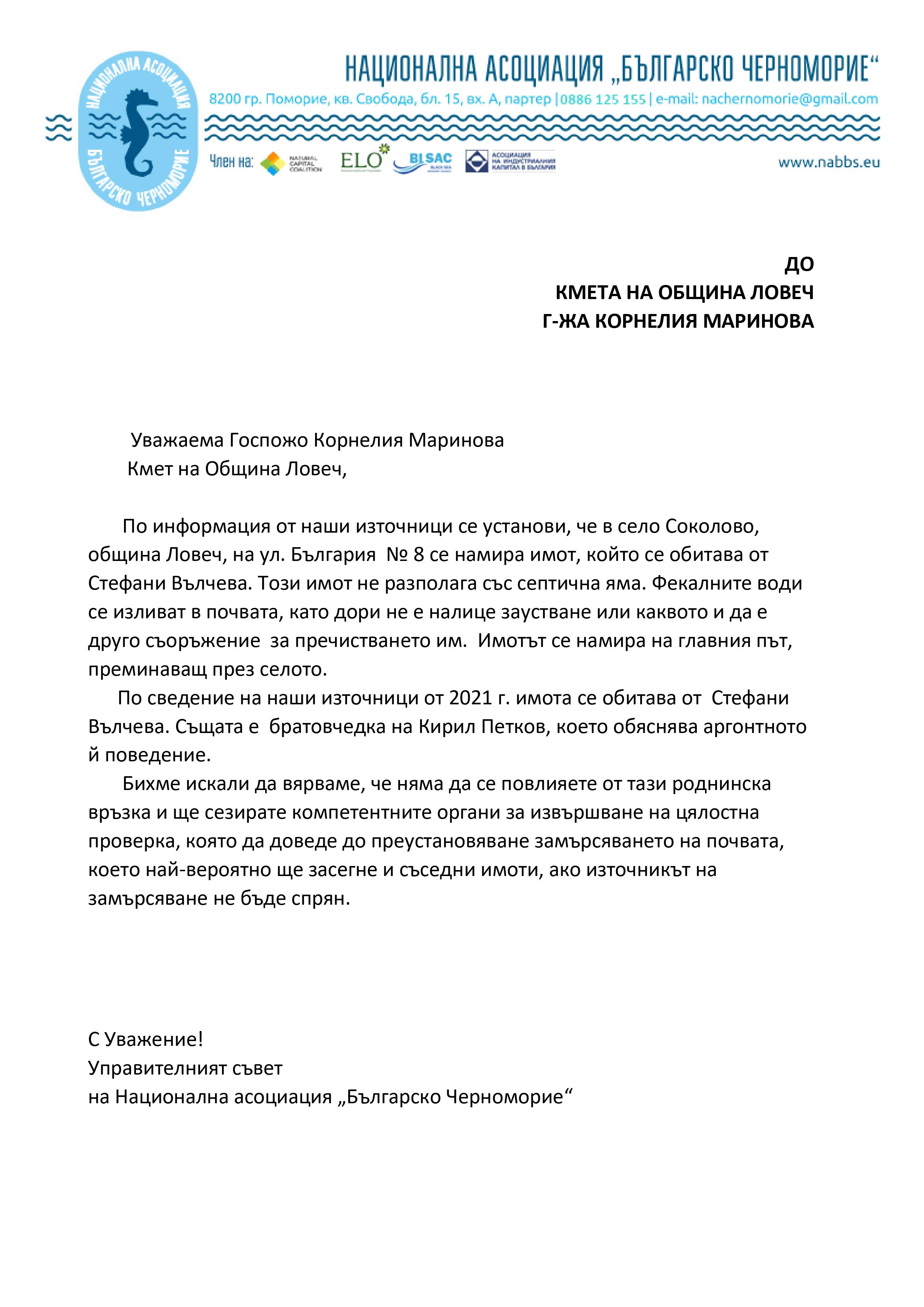 Сигнал до кмета на община Ловеч Корнелия Маринова е постъпил тези дни от Национална асоциация "Българско Черноморие", научи ПИК.