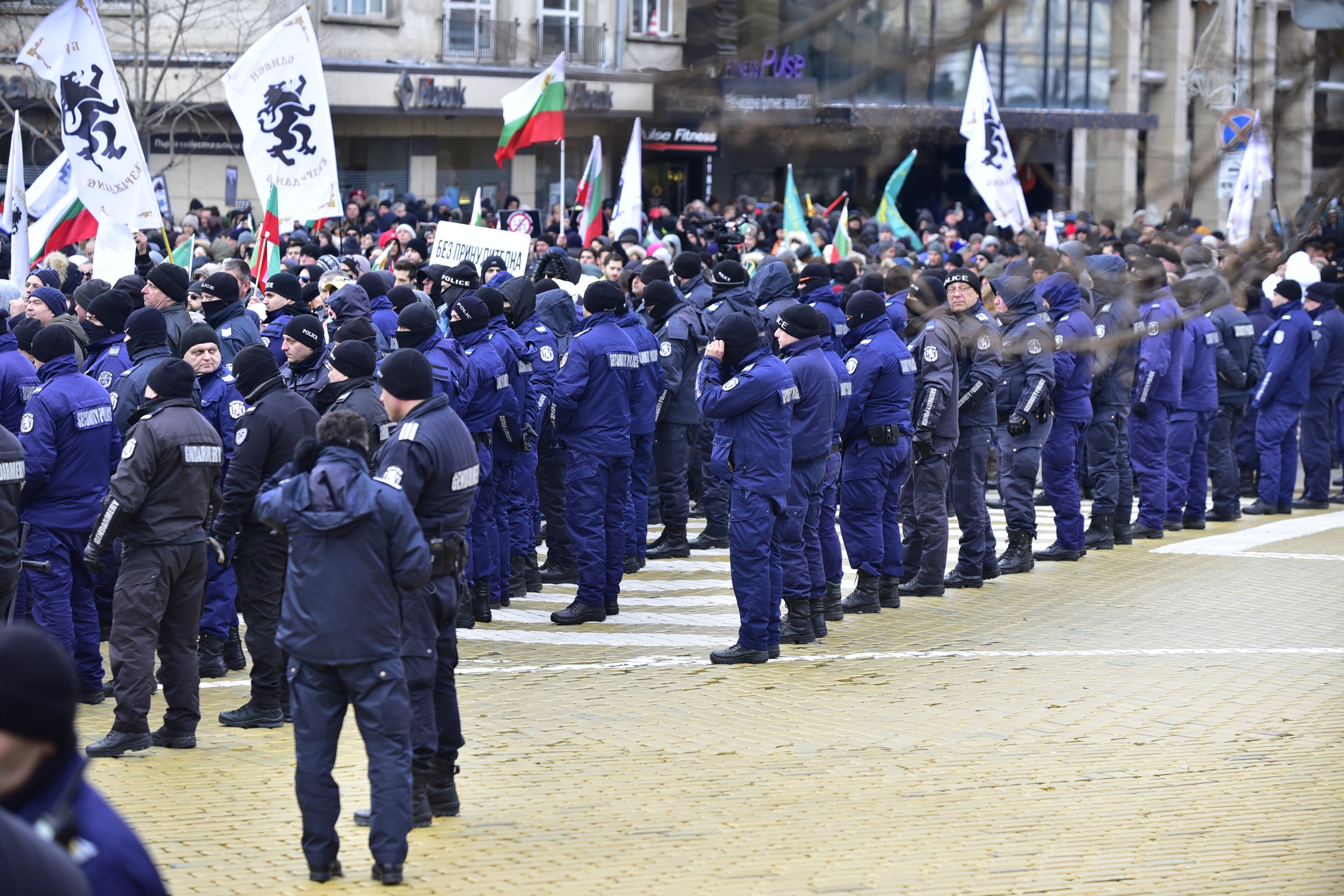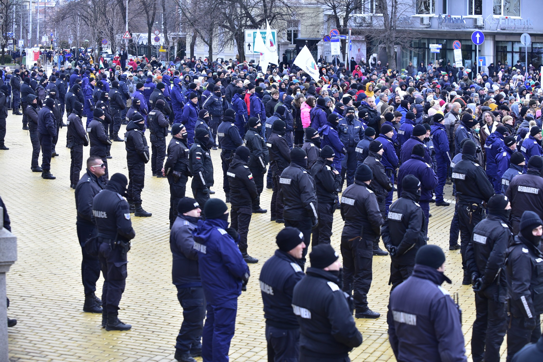 Органи на реда са разположени и по страничните входове на Народното събрание, които допълнително са подсигурени и от метални ограждения.