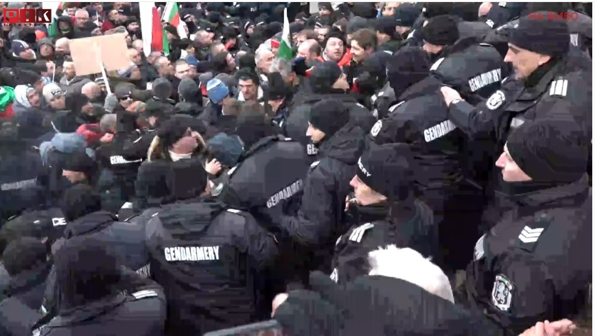 Въпреки това се стигна до сблъсъци, след като протестиращите опитаха да пробият кордона на полицаите. Органите на реда обаче се събраха в плътни кордони и опитват да изблъскат недоволните граждани назад.