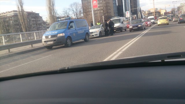 Полицейски отряд заклещи преди минути бял спортен мерцедес на моста на панаира, съобщи Марица.бг.