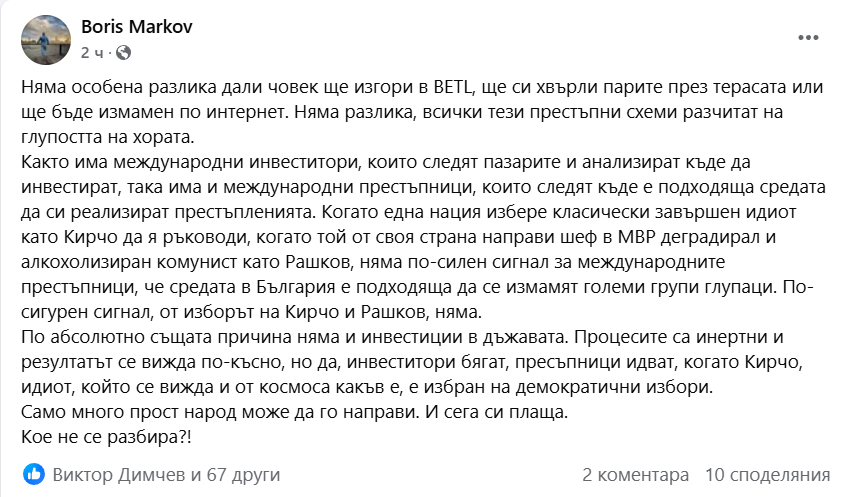 Когато една нация избере класически завършен идиот като Кирчо да я ръководи, когато той от своя страна направи шеф в МВР деградирал и алкохолизиран комунист като Рашков, няма по-силен сигнал за международните престъпници, че средата в България е подходяща да се измамят големи групи глупаци. По-сигурен сигнал, от изборът на Кирчо и Рашков, няма", заяви Марков в социалната мрежа.