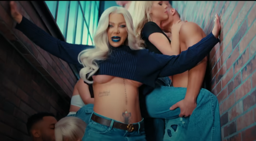 Докато певицата се кълчи, дясната й гърда изскача почти в цялост изпод късата й блуза и става ясно, че е прикрила зърното си.