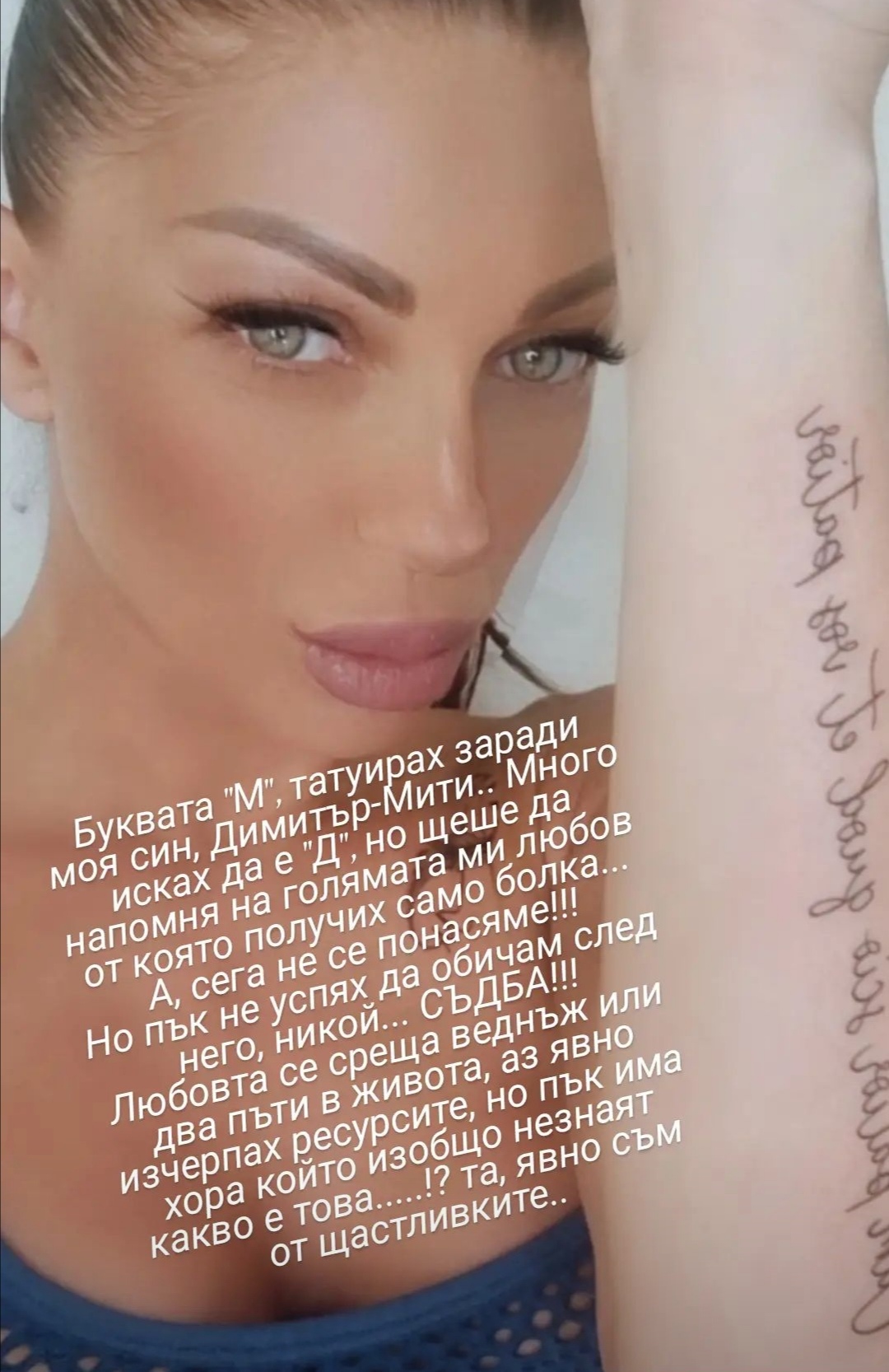 "Буквата М татуирах заради моя син, Димитър - Мити. Много исках да е Д, но щеше да напомня на голямата ми любов, от която получих само болка... А сега не се понасяме!!! Но пък не успях да обичам след него никой... СЪДБА!!! Любовта се среща веднъж или два пъти в живота, аз явно изчерпах ресурсите, но пък има хора, които изобщо не знаят какво е това... Та аз явно съм от щастливките", написа Емануела.