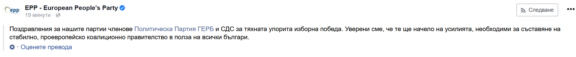 "Поздравления за нашите партии членове Политическа партия ГЕРБ и СДС за тяхната упорита изборна победа. Убедени сме, че те ще са начело на усилията, необходими за съставяне на стабилно проевропейско коалиционна правителство в полза на всички българи."
