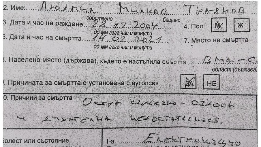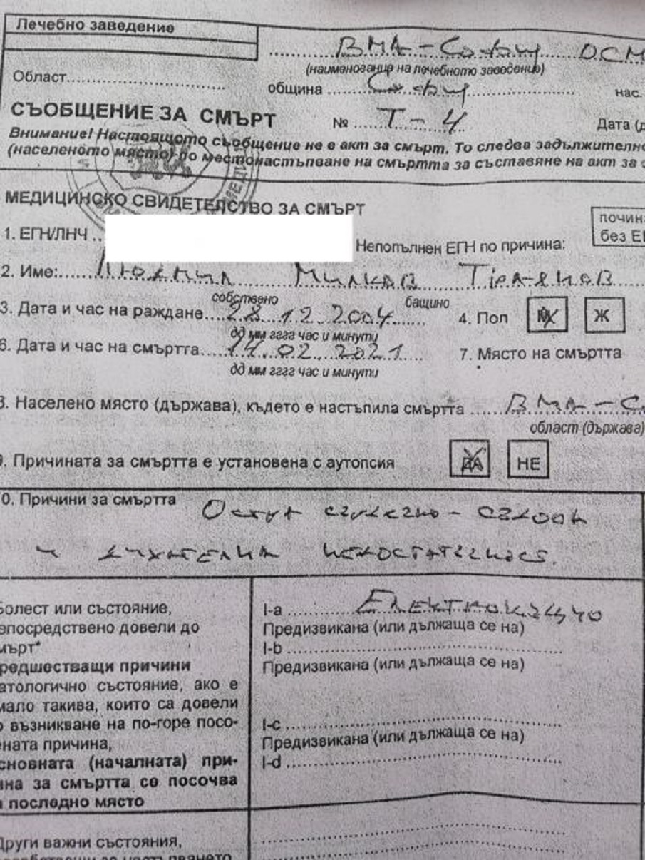 Бащата на загиналото след токов удар 16-годишно момче - Снежан Методиев, пожела всички всички да видят, че няма никаква друга причина за смъртта на сина му Людмил извън остра сърдечно-съдова и дихателна недостатъчност, причинена от електрошоков удар. Той показа смъртния акт, съобщава Труд.
