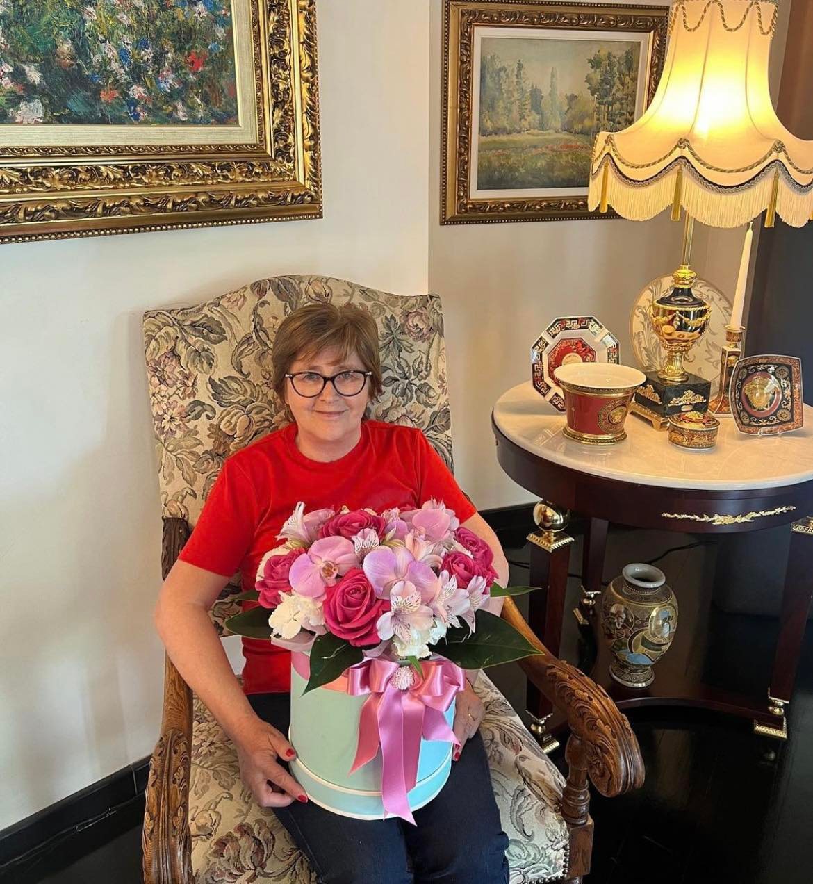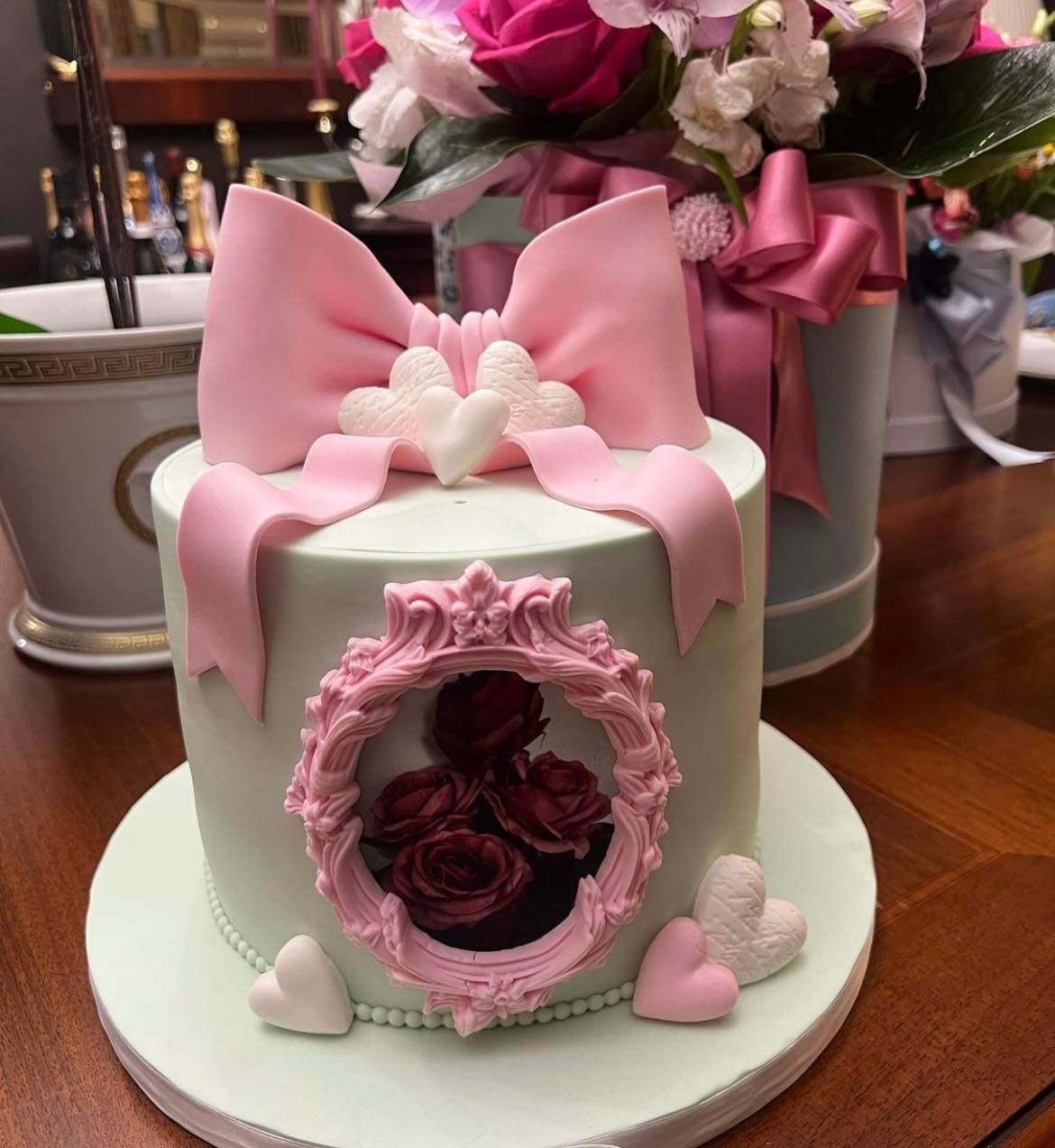 Дизайнерска торта в пастелни пролетни цветове, поднесена с кутия с пищен букет от рози, орхидеи и перуанска лилия поднесе многодетната майка Светлана на рожденичката, пише "Хотнюз".