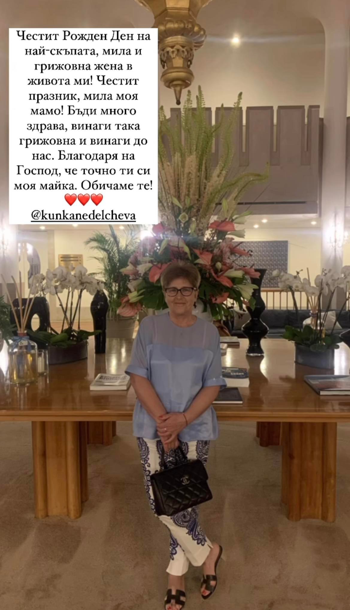 "Честит Рожден Ден на най-скъпата, мила и грижовна жена в живота ми! Честит празник, мила моя мамо! Бъди много здрава, винаги така грижовна и винаги до нас. Благодаря на Господ, че точно ти си моя майка. Обичаме те!", пък написа Гущерова към стори, с което честити празника на Кунка.
