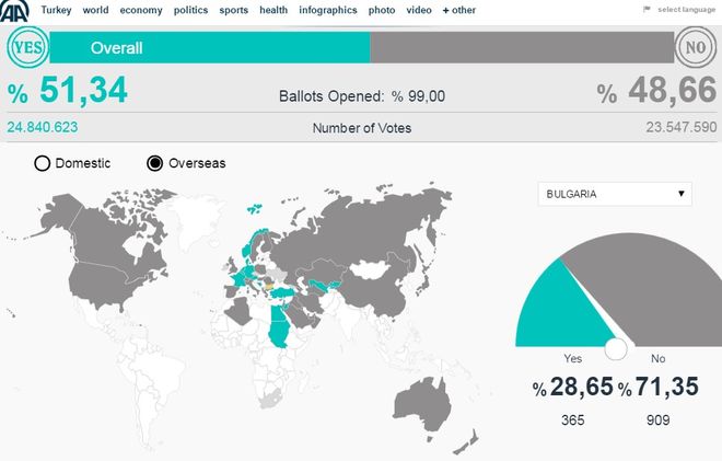 При 99% обработени бюлетини данните показват, че в Турция 51.3% са гласували „За”, а 48.7% са гласували „против” на референдума.